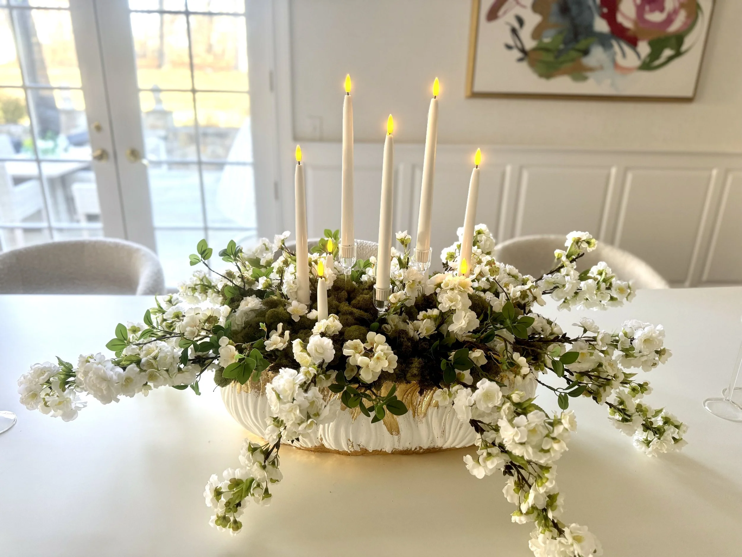 The final result is a show-stopping, high-end centerpiece that perfectly balances modern elegance with timeless charm. The combination of soft, matte white with the rich gold leaf detailing creates a luxe contrast that feels both effortless and intentional. Paired with delicate faux cherry blossoms and the warm glow of taper candles, this centerpiece brings an inviting, sophisticated touch to any dining space.