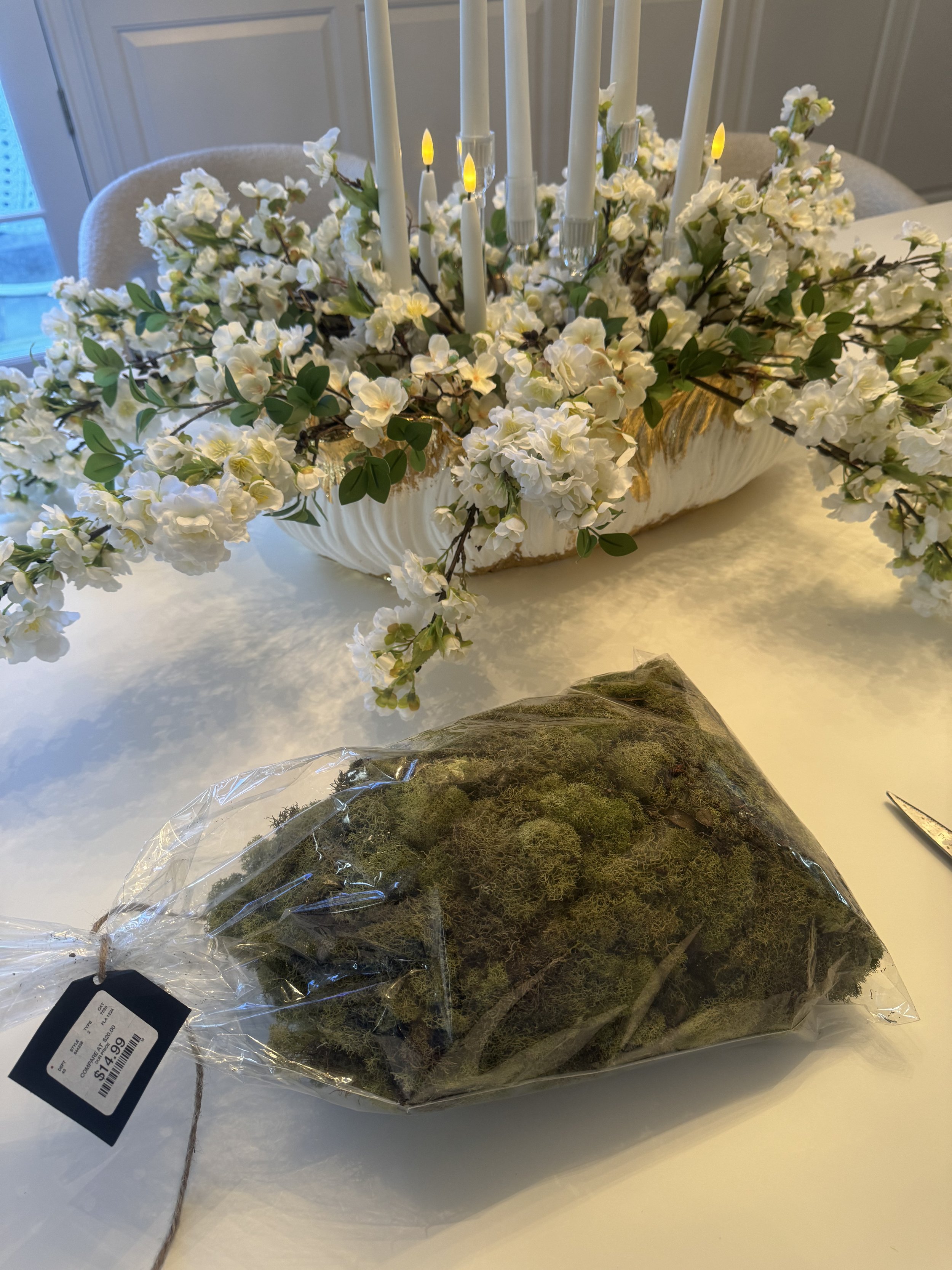 8. To finish, fluff and place moss inside the bowls around the candlestick holders and cherry blossom stems to cover any holes.