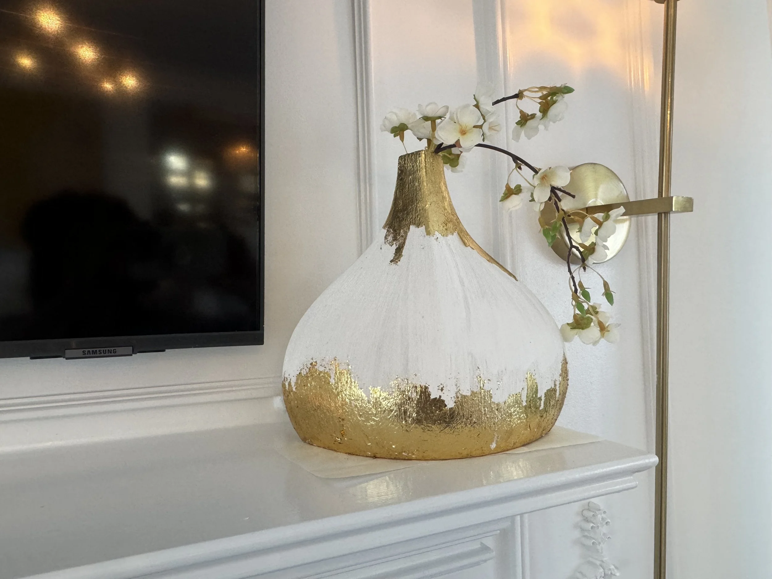 The finished vases turned out even better than I imagined! The combination of soft matte white and the irregular gold leaf detailing creates the perfect balance of modern elegance with a slightly organic, handmade feel. The gold catches the light beautifully, giving that rich, metallic pop that instantly elevates a space.