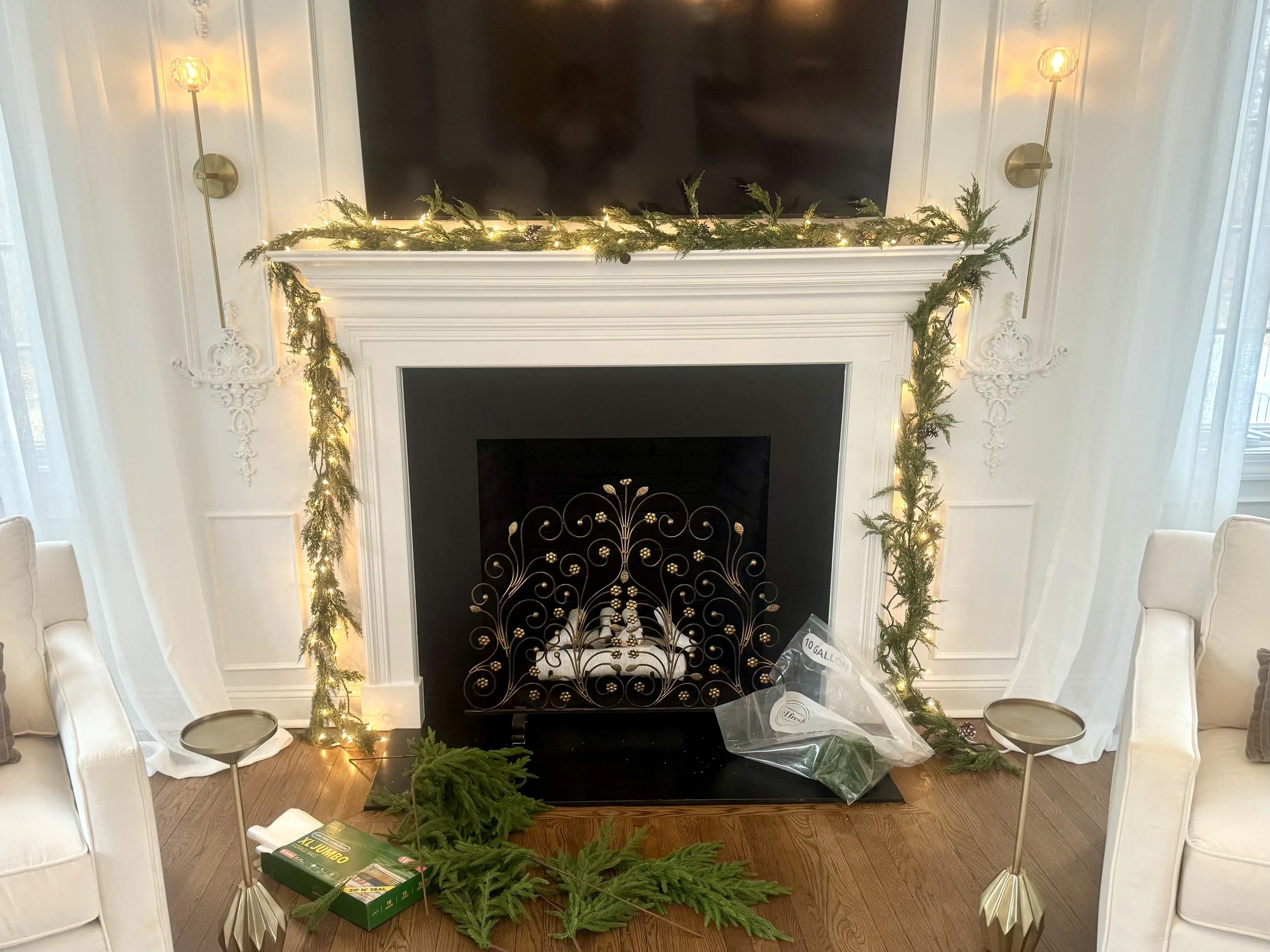 I love doing a simple mantel during the holidays, but in order for that to make a big impact, the garland needs to look lush and full. I’ve had the hardest time finding a single garland strand that does everything I want it to, but I’ve developed an easy “secret” that you should all know. You can purchase individual garland branches from Amazon for a great value (comes out to less than $2/branch) and stick them throughout your garland strand to give it a wispy and voluminous look that is just so luxe. I also like to spread any extra branches I have throughout other areas where I have decor (like tabletops and counters) to tie the whole look together.